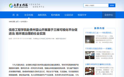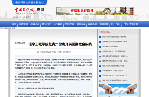 9月12日,中国新闻网对我校“三下乡”暑期社会实践“全国重点服务团”--信息工程乐鱼网页版登录入口赴贵州雷山实践团进行报道。信息工程乐鱼网页版登录入口赴贵州雷山实践团前往贵州省黔东南苗族侗族自治州雷山县开展暑期社会实践,以技术发展为基础,以促进环境治理为目的,以培养学生创新意识、环保意识的积极性和主动性为宗旨,以媒体宣传为项目开展的纽带,期间深入调研走访。大学生网报、贵州网、贵州热线、天津都市报、今日头条等媒体也先后报道了此次社会实践活动。